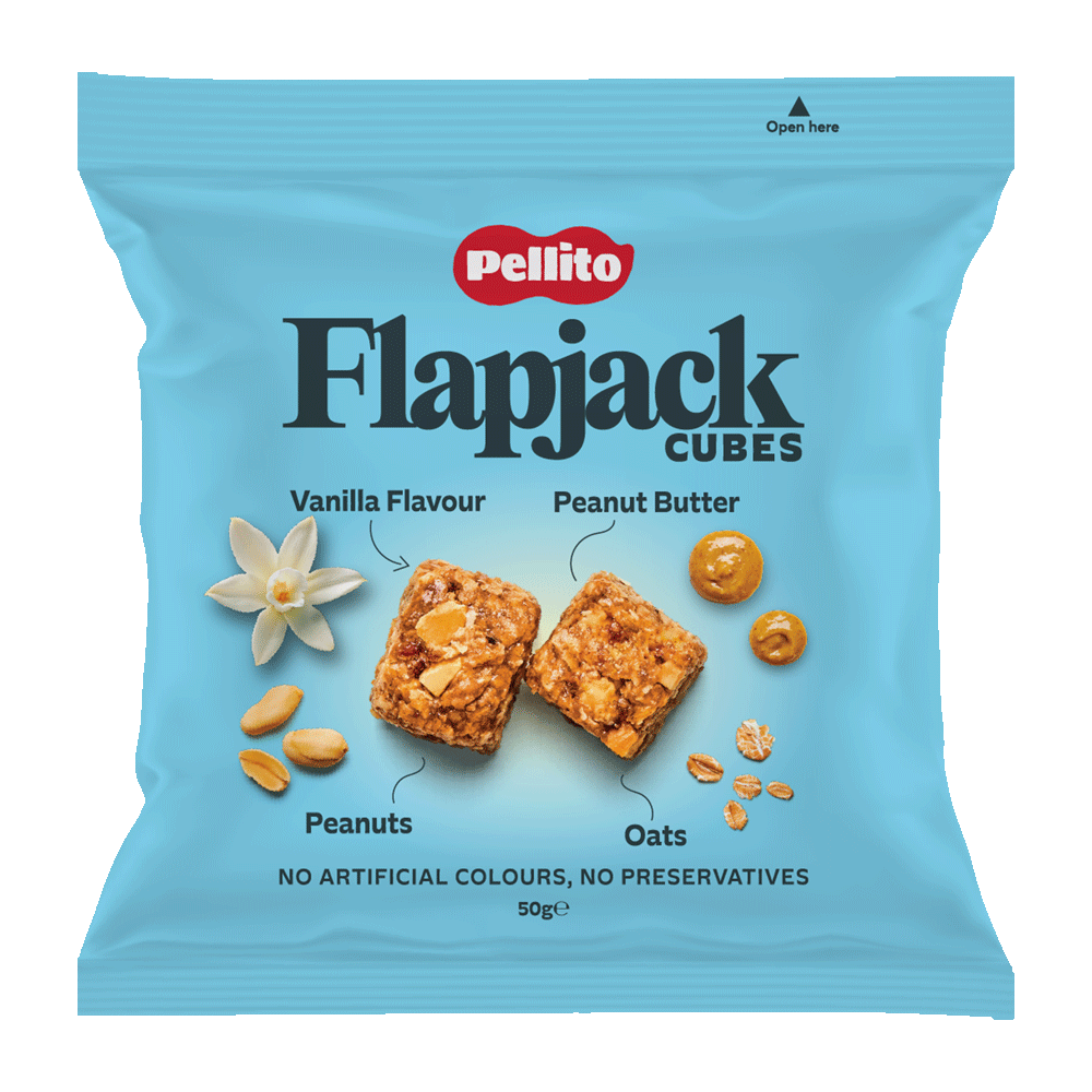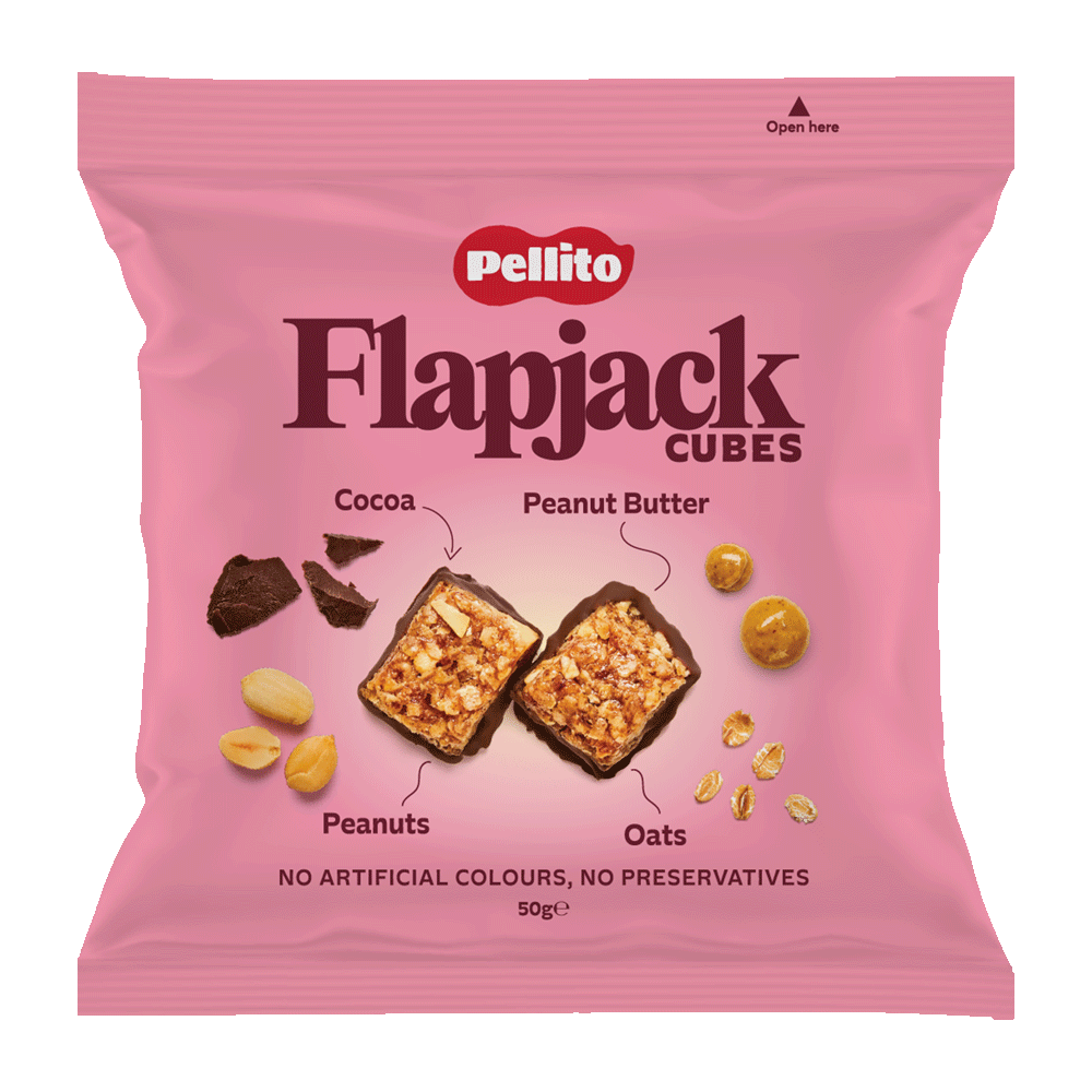Baked oat cubes made with golden syrup, oats, peanuts, peanut butter, date paste & vegetable oils. A chewy, flavourful energy bite in 2 unique flavours: Vanilla & Chocolate. The magic of Pellito flapjack lies in its simple, quality yet flavourful ingredients which combine to create the perfect balance of sweetness, chewiness, and flavour richness. Νο artificial colours, no preservatives. A Healthy & Nutritious Snack!